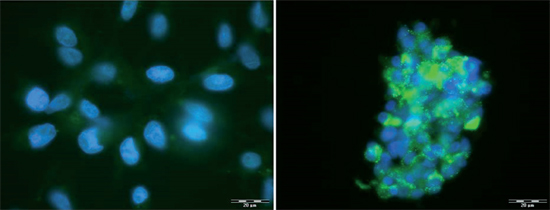 La línea RCPTH ha tenido más de 200 subcultivos. En los presentes resultados no logramos detectar niveles importantes de PTHi en el medio de cultivo y tampoco evidencia de presencia de PTH intracelular. Se realizó tinción de inmunoflourescencia con Anticuerpo anti PTH humana (Abcam ab53040) con control positivo de cultivo primario de muestra de hiperplasia de paratiroides obtenido de un paciente con insuficiencia renal sometido a paratiroidectomía subtotal (Figura 7).
