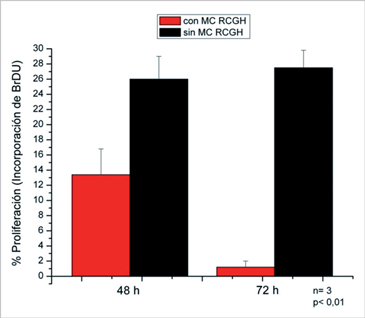 Hasta ahora hemos visto que la línea celular tiene mitosis aisladas en la observación directa de las placas de cultivo. El porcentaje de incorporación de BrDU en condiciones estándar no es muy elevado, concordante con la observación previa. El medio condicionado de la línea RCGH aumenta el tiempo de duplicación en las células de paratiroides humana (Figura 8). Esto se corroboró estudiando el porcentaje de células que incorporan BrDU, traduciendo que este aumento del TD es por disminución de la proliferación (Figura 9).