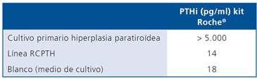 Luego de más de 200 subcultivos la línea celular comenzó a disminuir la secreción de PTH en el medio. Se realizó un experimento aislado de medición de PTHi con kit immulite (DPC)® en medio condicionado (sobrenadante) de cultivos primarios de paratiroides humana (hiperplasia paratiroídea), cultivos de la línea RCPTH y medio de cultivo sólo como blanco. Los resultados son categóricos demostrando que la línea RCPTH perdió la capacidad de secreción in vitro (Tabla 1).