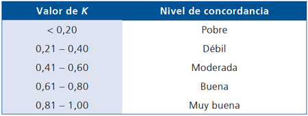 Para interpretar el valor de κ es útil disponer de una escala como la siguiente en que se han convenido los siguientes valores: