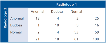 Por ejemplo, supongamos que dos radiólogos informan 100 imágenes ecográficas de la glándula tiroides, obteniéndose la siguiente información: