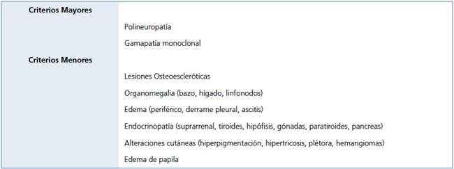 Con respecto al cuadro clínico, por definición todos los pacientes tienen neuropatía periférica y gamapatía monoclonal. Además, casi todos tienen plasmocitoma o enfermedad de Castleman. La prevalencia de otras manifestaciones varia según las distintas series. En base a esto, se han propuesto criterios diagnósticos para mejor definición del síndrome (Tabla 1)5. Para el diagnóstico se requiere de los dos criterios mayores (polineuropatía y gamapatía monoclonal) y al menos un criterio menor (lesiones óseas escleróticas, enfermedad de Castleman, organomegalia, edema, endocrinopatía, cambios cutáneos o edema de papila).