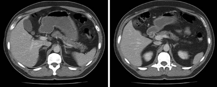 Hombre de 43 anos con antecedente de HTA, diagnosticada 3 anos antes, en tratamiento con Valsartan, Hidroclorotiazida y Carvedilol. No tenia antecedentes personales ni familiares de importancia. Se derivo a Endocrinologia por HTA de dificil manejo, con sospecha de hiperaldosteronismo. El paciente no referia sintomas respecto de cambio de peso, edema, episodios de taquicardia o hipertension, cefalea, palpitaciones, ni temblor de extremidades. En los examenes destacaba: Aldosterona plasmatica: 27,2 ng/dL; ARP: 0,5 ng/mL/h; AP/ARP 54,4; sodio 142 mEq/L; potasio 3.8 mEq/L; creatinina 0.94 mg/dL. Ecografia doppler renal normal. Dada la gravedad de la hipertension no se hizo prueba confirmatoria, por considerar que la administracion de fludrocortisona o la infusion salina eran potencialmente peligrosas. La TAC de abdomen mostro un nodulo unico de la corteza suprarrenal derecha de 11 x 5 mm (Fig. 2). Al examen fisico presentaba buen estado general con indice de masa corporal de 29, presion arterial 170/110 mmHg (en tratamiento). Para completar el estudio se realizo un CVS con infusion de ACTH (50 μg/h), que concluyo hallazgos compatibles con adenoma suprarrenal derecho secretor de aldosterona, y supresion de la glandula suprarrenal izquierda (Tabla 1b). Se inicio tratamiento preparatorio con Espironolactona, para luego efectuar suprarrenalectomia derecha por via laparoscopica. En el control medico 3 meses despues de operado, el paciente estaba en buenas condiciones generales, asintomatico, sin terapia antihipertensiva, con presion arterial de 120/80 mmHg y con valores normales de renina y aldosterona.