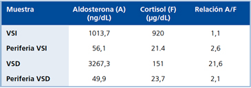 Tabla 1b. Resultado del CVS del caso clínico 2, que muestra lateralización a derecha de la secreción de aldosterona.