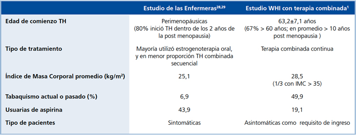Se han hecho muchos intentos para explicar la divergencia entre los resultados de estudios observacionales y la primera rama del estudio WHI7. En la Tabla 2 se resumen las mayores diferencias entre las pacientes del estudio observacional de las Enfermeras Norteamericanas y el WHI. Se observa que la edad de las mujeres del estudio WHI era mayor, con más de 10 años de postmenopausia en promedio; también eran más obesas, más fumadoras y utilizaron TH en esquema combinado continuo en contraste con el predominio de estrogenoterapia pura en el estudio de las Enfermeras. Como se mencionara, la segunda rama del estudio WHI demostró que la terapia estrogénica sola tenía menores riesgos que la TH combinada continua (Tabla 1).