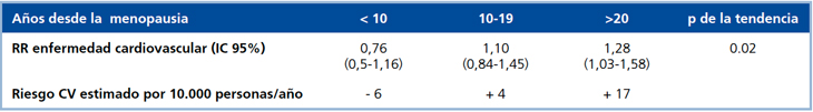 Esta hipótesis también ha sido reafirmada por un análisis secundario del estudio WHI combinando las participantes de las dos ramas15. En él se estudió si el efecto de la TH sobre el riesgo CV variaba dependiendo de la edad de la mujer al inicio de la terapia, ya sea con terapia combinada continua o con estrógenos solos. Se comprobó que el riesgo CV aumentaba significativamente a mayor edad de inicio de la TH (Tabla 4).