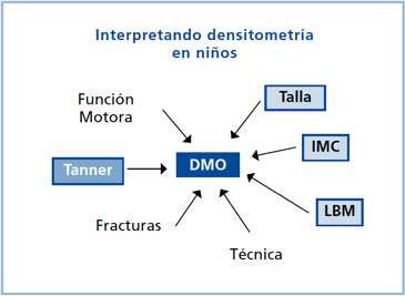 En el niño, la evaluación de CMO y DMO es influenciada por factores que deben ser considerados atentamente (Figura 3); la interpretación de los resultados se debe sustentar en los datos de una anamnesis cuidadosa, en el examen físico acucioso y en las consideraciones de la enfermedad de base, para diseñar las estrategias de corrección apropiadas en la ejecución del examen de densitometría y en su interpretación.