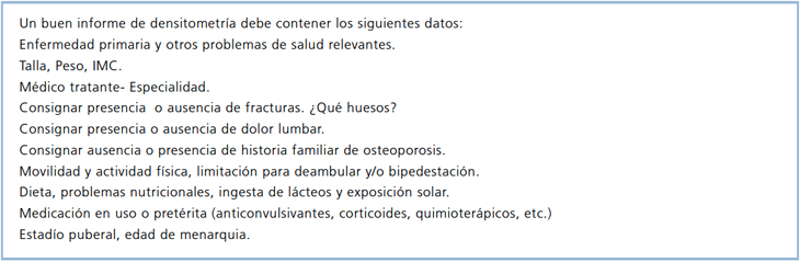 Tabla 2. Datos que debe contener un informe adecuado de densitometría pediátrica.