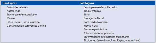Sin embargo, en acuerdo con la validez de lo expresado anteriormente, no debe olvidarse que existen causas espurias que también pueden explicar la detección anómala de I131 en el rastreo. Ellas son variadas y corresponden a situaciones tanto normales como patológicas; algunas se deben a captaciones del isótopo, en el sentido real de la palabra, y otras a acumulaciones de líquidos (saliva u otros) que contienen I131 (Tabla 1).