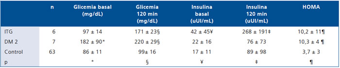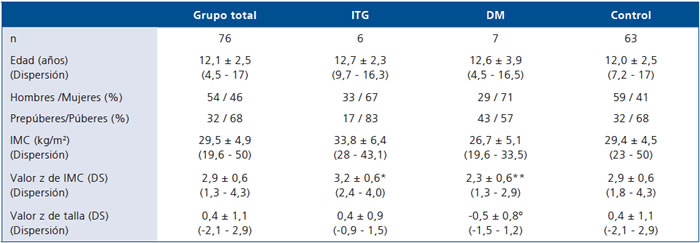 *ITG > DM2 (p = 0,012) y DM2 < Control (p = 0,028). ºDM2 < Control (p = 0,034).