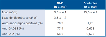 Tabla 1. Características clínicas y marcadores inmunológicos en 248 niños con diabetes tipo 1 y 160 controles chilenos