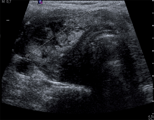 En la tomografía computarizada se apreciaba una tumoración heterogénea sobre el lóbulo tiroideo derecho que producía una desestructuración del mismo, provocando desviación de la tráquea hacia la izquierda, y comprimiendo el esófago. Se realizó punción aspiración con aguja fina (PAAF) guiada ecográficamente (Figura 1) del nódulo, obteniendo células con atipia de significado indeterminado, aunque insuficientes para indicar que la lesión fuese maligna.