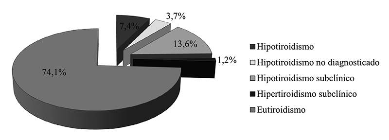 En relación a patología tiroidea, 6 pacientes (7,4%) tenían el diagnóstico previo de hipotiroidismo y se encontraban en tratamiento. Según las mediciones de TSH y T4 total o T4L, 3 (3,7%) tenían hipotiroidismo no diagnosticado, 11 (13,6%) HSC y 1 (1,2%) hipertiroidismo subclínico. Ningún paciente presentó hipertiroidismo (Figura 1).