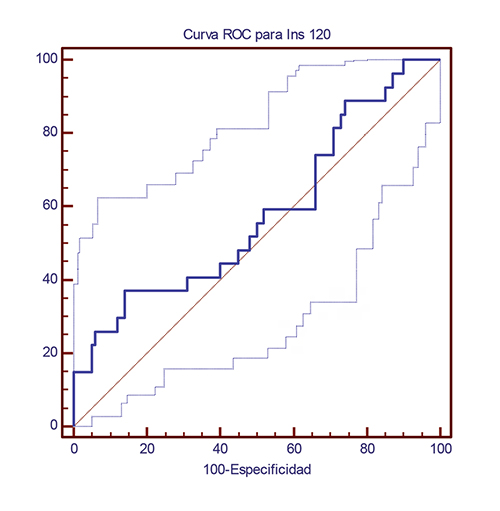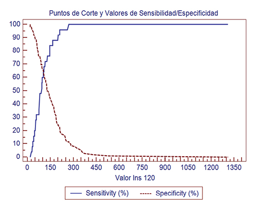 En cuanto a la I120, en nuestro medio ha sido el examen de elección para el diagnóstico de IR. Sin embargo, se ha demostrado que esta determinación no es un buen parámetro ya que, existe superposición de valores entre pacientes intolerantes a la glucosa, diabéticos y controles17,18. Este hecho también fue observado en nuestros casos. Como mencionamos, el punto de corte sobre 60 µUI/ml, utilizado para separar a los individuos normales de los IR, deriva de un estudio diseñado con el fin de establecer la asociación de factores de riesgo coronario e hiperinsulinemia y no con fines diagnósticos3. Por otra parte, no contamos con puntos de corte de I120 ajustados a nuestra población, que permitan discriminar entre pacientes IR y normales. Como demostró el trabajo de Arancibia et al, el nivel de corte más adecuado estaría sobre 80 µUI/mL4. En nuestro estudio, la sensibilidad y especificidad más altas se obtuvieron para un valor sobre 100 µUI/mL.