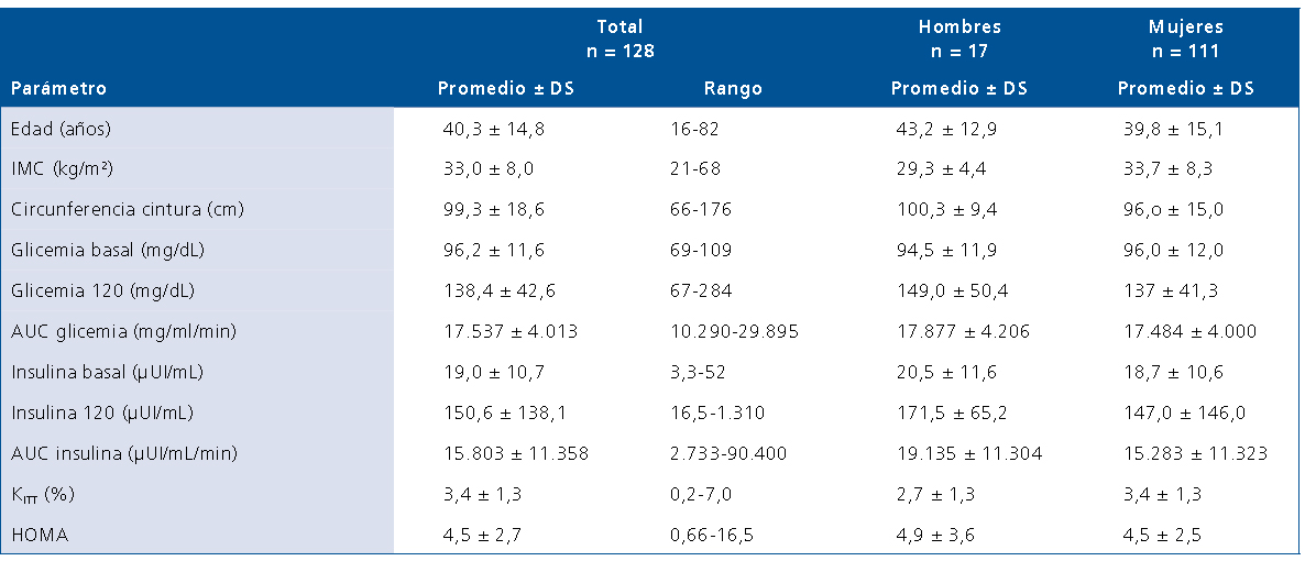 De acuerdo a la glicemia postcarga, 45 casos (35,2%) tenían intolerancia a la glucosa y 9 (7%) tenían diabetes. La Tabla 3 muestra que la glicemia basal fue significativamente más alta en los intolerantes a la glucosa y diabéticos comparados con los casos con tolerancia a glucosa normal. De los otros parámetros, sólo el TTIIV fue significativamente diferente entre los 3 grupos, identificando a los más insulino resistentes (p = 0,025).