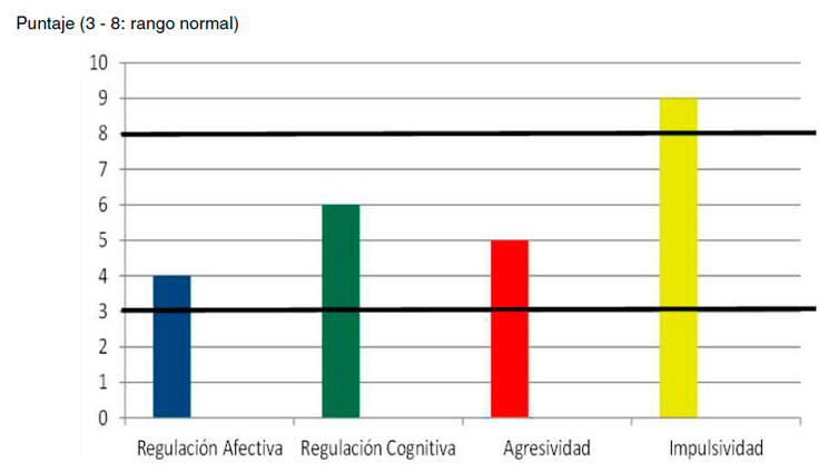El test de los colores de Max Lüscher5 es una prueba proyectiva que evalúa indicadores emocionales que influyen en la capacidad adaptativa y describe algunas características estables de la personalidad. En una primera etapa, el evaluado debe priorizar preferencias entre 8 colores presentados; y en una segunda etapa debe priorizar entre variaciones de los colores azul, verde, rojo y amarillo. La elección cromática de la paciente presentó indicadores de estabilidad emocional en la lámina de variaciones: regulación afectiva (azul), regulación cognitiva (verde) dentro de rangos normales, con agresividad controlada (rojo) y leve aumento de la impulsividad (amarillo) (Figura 1).