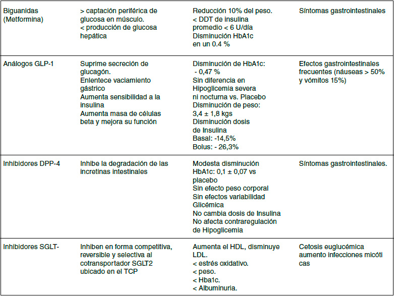 Una variedad de medicamentos están disponibles para terapia de combinación; sin embargo, se debe considerar que la evidencia clínica es muy limitada para cada uno de estos medicamentos en la población pediátrica. Entre los agentes adicionales que por su perfil de seguridad se podrían intentar con precaución en niños y especialmente en adolescentes con DM1 incluyen los incretino-mimeticos: inhibidores de DPP-4 y agonistas de GLP-1; los glucosúricos: Inhibidor de SGLT2 y duales y la más antigua y conocida Metformina, aunque esta última no ha demostrado claramente mejorar el control metabólico de adolescentes con DM1, sin embargo logra disminución del peso y de la dosis de Insulina, por lo que puede ser de utilidad en algunos casos. Los eventos adversos, las dosis, la administración y el tipo de monitoreo deben tenerse en cuenta al tomar la decisión de agregarlos como terapia adyuvante.