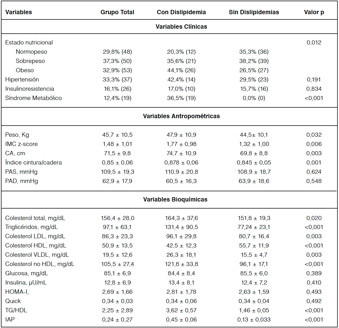 En la tabla 1 se resumen las variables clínicas, antropométricas y bioquímicas del grupo de estudio según presencia de dislipidemias. Sujetos dislipidémicos presentaron mayor prevalencia de sobrepeso y obesidad y SM (p<0,05), mientras que no se observaron diferencias en las frecuencias de hipertensión y RI. Igualmente estos individuos tuvieron mayores valores de IMC z-score, circunferencia abdominal e ICC (p<0,05).