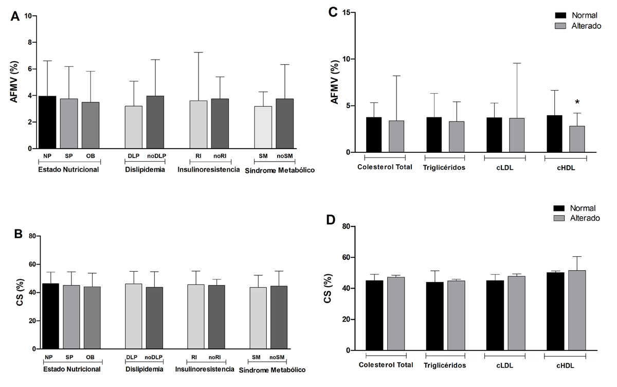 En la figura 1 se presenta el porcentaje de AFMV y CS de acuerdo a diferentes condiciones clínicas y según alteración específica de parámetros del perfil lipídico. El %AFMV (Figura 1A) y %CS (Figura 1B) no varió según estado nutricional, dislipidemia, RI o presencia de SM (p>0,05).
