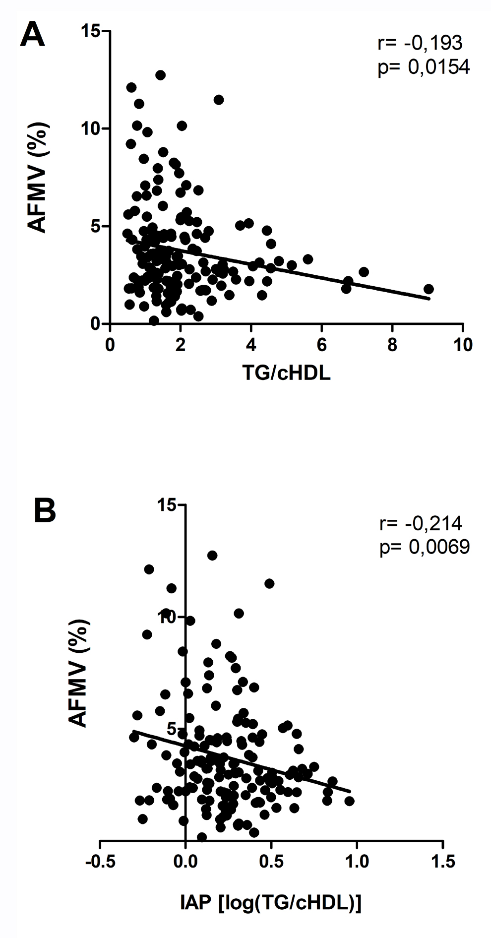 El %AFMV se relacionó con menor riesgo aterogénico de acuerdo a los índices de riesgo evaluados. Como se observa en la figura 2, el %AFMV se correlaciona inversamente con valores de los índices aterogénicos TG/cHDL (r=-0,193, p=0,015; Figura 2A) e IAP (r=-0,214, p=0,006; Figura 2B).