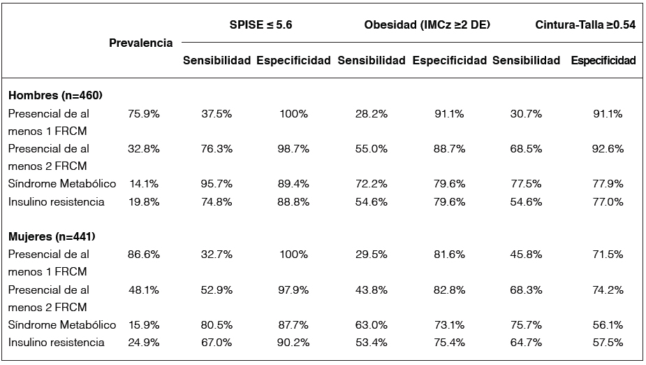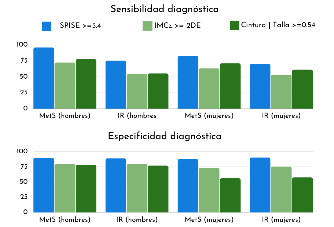 La tabla 3 muestra la sensibilidad y especificidad de los tres indicadores para estimar MetS, IR y la presencia de al menos uno o dos componentes del MetS, en ambos sexos. Para los tres indicadores, la especificidad fue mejor que la sensibilidad al diagnosticar MetS, IR y número de componentes del MetS, lo que indica que se discrimina mejor a los sujetos que no presentan la condición a diagnosticar. A pesar de eso, SPISE mostro una mejor sensibilidad para identificar a los portadores de MetS e IR (96% y 75% en varones y 81% y 67% en mujeres, respectivamente) que un IMC ≥2.0 DE y una relación cintura | talla ≥0.54 (Figura 2).