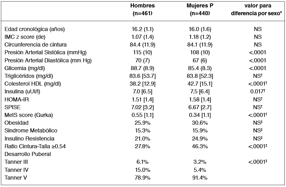 Un endocrinólogo evaluó a los adolescentes utilizando procedimientos estandarizados para medir el peso con una & co. Hamburgo, Alemania), y la altura con una precisión de 0.1 cm, usando un estadiómetro Holtain. La circunferencia de cintura (CC) se midió a nivel del ombligo, utilizando cintas métricas (Seca 201, Seca GmbH & co. Hamburgo, Alemania). Se calcularon el IMC-z según edad y sexo y la relación cintura | talla. El estado nutricional se calificó utilizando los referentes OMS 2007 y se consideró obesidad cuando el IMC-z fue ≥2.0 DE20. Una relación cintura | talla ≥ 0.54 se consideró indicativa de RCM de acuerdo a un estudio nacional21. El grado de desarrollo puberal alcanzado se evaluó utilizando los criterios de Marshall y Tanner22,23.