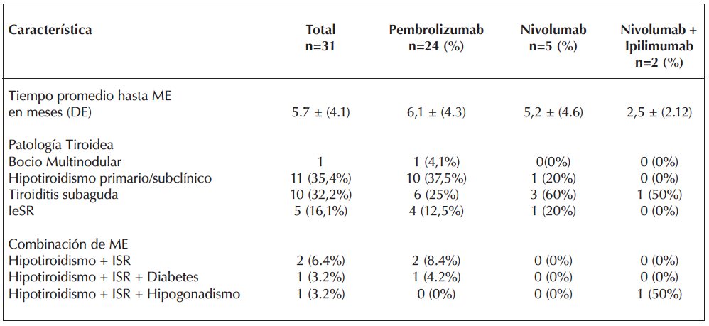 Dos pacientes presentaron tres ME cada uno: Uno desarrolló HT, IeSR y diabetes mellitus (con debut de cetoacidosis diabética severa que requirió manejo intensivo con insulina) bajo tratamiento con pembrolizumab y otro paciente, tratado con una combinación de nivolumab e ipilimumab, presentó HT, hipogonadismo hipogonadotrófico e ISR. La tabla 3 resume la distribución de los tipos de ME observadas.