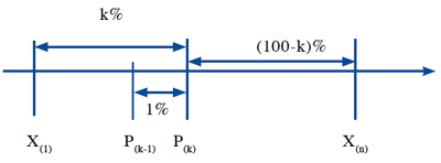Se llama percentil a cada uno de los números que dividen la muestra en 100 partes iguales. En consecuencia, ellos son 99 y se denotan por P(k), donde k es el orden del percentil indicado. Dado el percentil P(k), éste divide la muestra en dos partes, la inferior que contiene el k% inferior de las observaciones y la superior que contiene el (100-k%) de las observaciones; entre dos percentiles consecutivos está contenido el 1% de la muestra. El siguiente esquema grafica las definiciones anteriores: