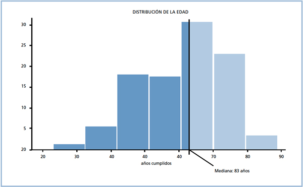 Figura 1. Representación de la mediana en un gráfico de distribución de la edad. El área clara y la oscura son iguales.