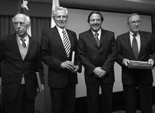 LLos ex presidentes de la SOCHED, doctores Luis Vargas Fernández, Alfredo Jadresic y Enrique López Caffarena, recibieron su galardón de manos del presidente de la Sociedad, el Dr. Hernán García.