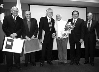 Los ex presidentes de la SOCHED, doctores Patricio Michaud, José Manuel López, Manuel García de los Ríos y Ronald Youlton, recibieron su galardón de manos de la Dra. Maria Isabel López.