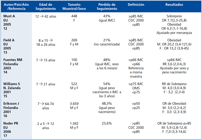 Se encontraron 6 estudios que evalúan la asociación existente entre obesidad infantil y obesidad en el adulto. Estos muestran consistentemente la existencia de esta asociación, independientemente de algunos errores metodológicos. El principal factor que pudo alterar los resultados en estos estudios, fue la pérdida en el seguimiento, que varió desde 21% a 54%; sin embargo, en la mitad de ellos se describió la población faltante respecto del IMC, mostrando que la condición nutricional fue similar a la población final, por lo tanto, el sesgo por este motivo puede ser considerado menor. El valor del OR va desde 2 a 20,2, mostrando una fuerte asociación. Es decir, aquellos que son obesos cuando niños tienen una mayor probabilidad de seguir siéndolo cuando adultos, independientemente de cuales fueran los factores etiológicos. Esto demuestra que una proporción importante de los que tienen malnutrición por exceso en la adultez, iniciarían esta condición precozmente en la vida.