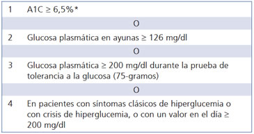 La asociación Americana de Diabetes (ADA) recomendó el uso de hemoglobina A1C para el diagnóstico de diabetes. Durante los últimas décadas, el diagnóstico de diabetes se ha basado en la medición de la concentración de glucosa plasmática en ayunas (umbral de 126 mg/dL) o después de una prueba oral de tolerancia a la glucosa (200 mg/dL). Basados en la recomendación de un comité internacional de expertos integrado por miembros de la Asociación Americana de Diabetes, la Asociación Europea para el Estudio de la Diabetes, y la Federación Internacional de Diabetes se aceptó el uso de la A1c. El Comité declaró que se hace diagnóstico de diabetes tipo 2 a cualquier persona con un valor de HbA1C confirmado de 6,5%, con o sin medición de glucosa. Los niveles de glucosa en ayunas o en la curva de tolerancia siguen siendo criterios diagnósticos de diabetes.