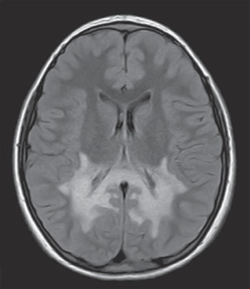 Figura 1. Resonancia Nuclear cerebral. Se observa una leucoencefalopatía con marcada alteración de la sustancia blanca periventricular, que se extiende a los cuerpos geniculados laterales y radiaciones ópticas alrededor de los cuernos occipitales.