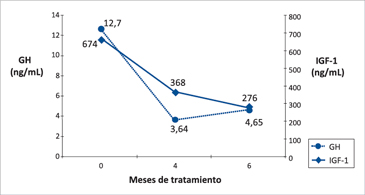 Se determinó comenzar terapia médica con Octeótrido, hasta esperar mejores condiciones generales del paciente para realizar la cirugía Hipofisiaria. Luego de 4 meses de tratamiento, con 3 ampollas de Octeótrido, los niveles de GH disminuyeron a 3,64 ng/mL y el IGF-1 a 368 ng/mL. Luego de 6 meses de tratamiento, 6 ampollas de Octeótrido se obtuvo GH de 4,65 ng/mL e IGF-1 de 276 ng/mL (Figura 2).