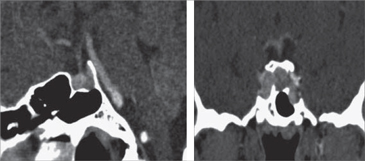 También se constató activación de su Acromegalia con niveles de GH de 12,7 ng/ mL, con Glicemias de 89,3 mg/dL basal, 190,8 mg/dL a los 30 minutos, 214,5 mg/dL a los 60, 199,3 mg/dL a los 90 y 123,2 mg/dL a los 120 minutos; con un IGF-1 de 674 ng/mL (Valor normal para edad: 87-238 ng/ mL). No se pudo realizar una Resonancia Nuclear Magnética por el Gadolinio; por lo cual luego de ingresar a hemodiálisis se realizó un TC de silla turca (Figura 1). En ésta, se apreció sólo cambios post quirúrgicos en el piso selar y un material con densidad de partes blandas ocupando la logia selar, de diámetro cráneo-caudal de no más de 6 mm.