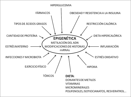 Figura 2. Diversos factores nutricionales que se han asociado con cambios epigenéticos.