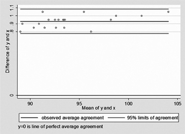Dentro de los límites de confianza no está el 0, por lo tanto, los métodos no son concordantes, como muestra el gráfico siguiente, en ningún caso se observó concordancia: