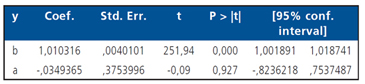 Para conocer la magnitud de la sobreestimación, se puede estimar la recta de regresión Y = a+b*X, resultado que se muestra a continuación:
