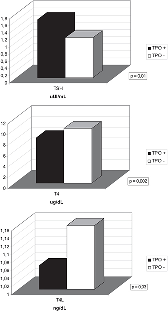 En pacientes con TSH normal, los anticuerpos anti TPO positivos determinaron TSH más alta, T4 total y T4 libre más bajas con significancia estadística (Figura 1). En el caso de TSH la diferencia se hace más marcada al incluirse todas las pacientes (p = 0,001), encontrándose la TSH promedio, con TPO positivos de 3,7 μUI/mL y sin TPO de 1,8 μUI/mL.