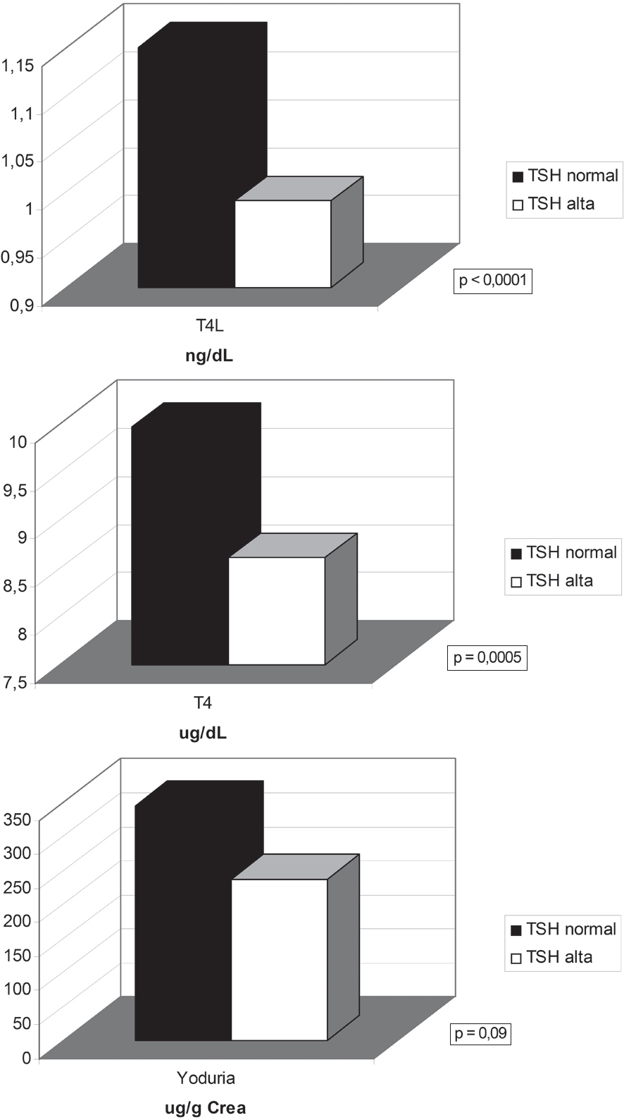 Se definieron como alterados aquellos valores de TSH > 2,55 μUI/mL o < 0,03 μUI/mL. La T4 total se considero normal entre 6,9 y 18 ug/dL (correspondiente a 1,5 veces la dispersion de nuestro laboratorio), segun lo establecido en el Consenso de Atlanta-Georgia de 2004 sobre enfermedades tiroideas maternas y desarrollo fetal. Se definio como baja aquella yoduria < 150 μg/L, lo que indica un consumo diario < 250 μg al dia, valor considerado como representativo de una ingesta adecuada durante el embarazo.