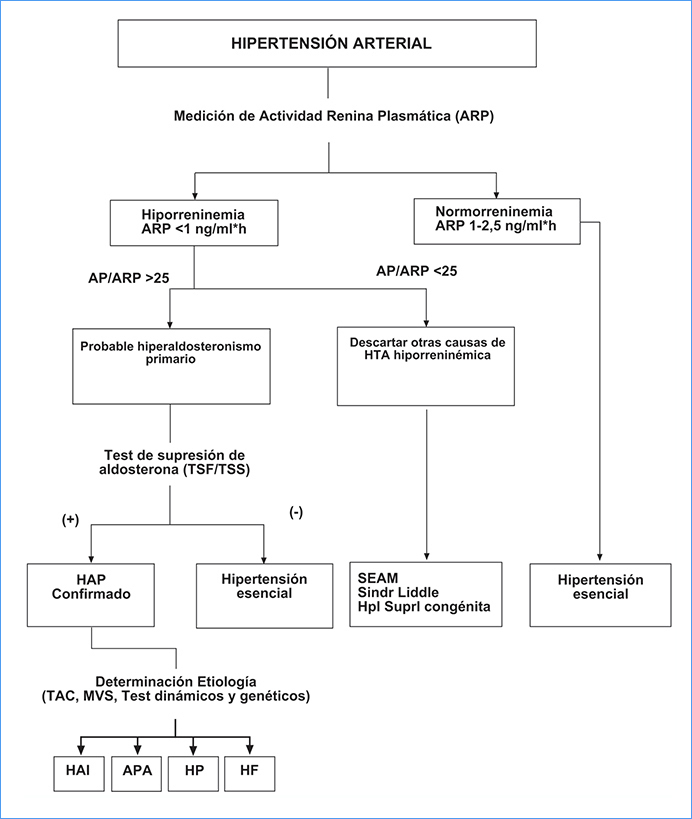 El diagnóstico de hiperaldosteronismo primario está enfocado a confirmar la autonomía de la secreción de aldosterona del eje renina angiotensina. Un esquema utilizado para realizar el diagnóstico de hiperaldosteronismo primario se muestra en la Figura 2.