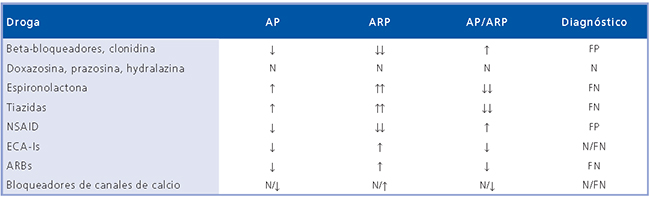 b) Determinación de la relación AP/ARP. La determinación aislada de aldosterona plasmática (AP) o actividad de renina plasmática (ARP) no es suficiente para el diagnóstico de HAP, en ambos casos hay condiciones que pueden inducir a errores en la determinación. Este margen de error puede ser disminuido si se calcula la relación AP/ARP37. Así, en el diagnóstico de HAP la pista más importante es demostrar un valor suprimido de ARP y un valor elevado de la relación AP/ARP. Recientemente nuestro grupo validó en normotensos un valor normal para la relación AP/ARP < 24, motivo por el cual consideramos elevada toda relación igual o superior a 257,38. Además establecimos que una relación AP/ARP elevada podía dar una falsa sospecha de HAP cuando valores normales de AP eran amplificados varias veces por valores muy bajos de ARP. Por esta razón, propusimos que el límite inferior de ARP no debía ser menor de 0,3 ng/mL*h cuando se realiza el cálculo. En pacientes con una relación de AP/ ARP mayor que 50, y niveles elevados de AP el diagnóstico de HAP es casi siempre confirmado, independiente del límite inferior de ARP considerado. Una ventaja de la determinación de la relación AP/ARP es que se ve menos afectada por la administración de drogas y por la posición de los sujetos, permitiendo su uso bajo condiciones menos restrictivas37,39. A pesar de esto, debe tenerse presente que drogas como los diuréticos y los bloqueadores del receptor de angiotensina pueden dar falsos negativos y el propanolol falsos positivos (Tabla 1). Sin embargo, si en un paciente que está tomando diuréticos se detecta una elevación de la relación AP/ARP, este hecho es fuertemente sugerente de un HAP. En nuestra experiencia, las muestras de AP y ARP pueden ser tomadas entre las 8 y las 10 AM después de que el paciente ha permanecido sentado por 15 min, y no necesariamente después de estar acostado por 2 h como indicaba el protocolo original40.