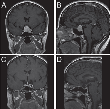 Un estudio de RM de silla turca evidenció un macroadenoma hipofisiario de 23 mm de diámetro mayor, con extensión supraselar, de modo que contactaba el quiasma óptico, e invadía el seno cavernoso izquierdo (Figura 1-A y B); sin embargo, la campimetría computarizada no mostró alteraciones.