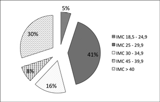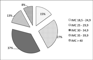 Se evaluó el estado nutricional clasificándolas de acuerdo al índice de masa corporal (Tabla 2). El 15% y el 27% presentaban un IMC normal y sobrepeso respectivamente mientras que el 58% eran obesas (Figura 1). Evaluamos esta característica según el rango etario dividiéndolas en 3 grupos (Tabla 3). Al evaluar las pacientes obesas el 24% del total correspondió a obesidad tipo 1, 20 y 9% a obesas tipo 2 y mórbidas respectivamente.