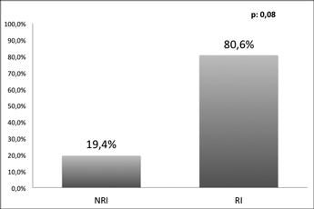 HOMA promedio de las pacientes fue 4,4 ± 2,3, rango 0,7-14. De ellas 95 (81%) presentó RI (HOMA > 2,5) (Figura 2). Se encontró Acantosis nigricans en el 64,9% con valor p: 0,002 utilizando c2 (Tabla 3). Por otra parte, RI se encontró en el 88,7% de las pacientes que presentan Acantosis nigricans.