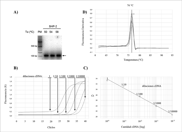 Figura 1. Puesta a punto oligonucleótidos para qPCR de SHP-2. A) Gel de agarosa mostrando amplificados (flecha) obtenidos con oligonucleótidos generados para SHP-2, con Ta de 50, 54 y 58°C; en el extremo izquierdo se muestra el marcador de peso molecular (100 pb ladder-Fermentas, USA). B) Plots de amplificación para oligonucleótidos de SHP-2 en presencia de diluciones seriadas de cDNA. C) Curva estándar resultante de los Ct de cada dilución. D) Curvas de melting para productos obtenidos con oligonucleótidos de SHP2 y diluciones seriadas de cDNA.