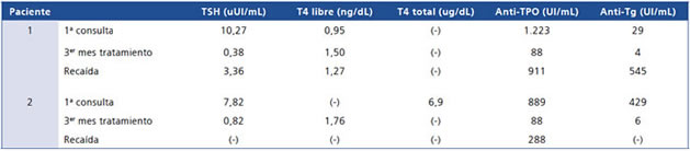 antitiroglobulina; (-) = no registrado. Valor referencia: TSH = 0,7-5,7; T4 libre = 1-2,1; T4 total = 6,4-13,3; Anti-TPO < 11; Anti-Tg < 4,1.