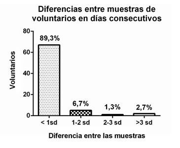 No se encontraron diferencias significativas al analizar los valores de cortisol entre día 1 y día 2 de los individuos controles. El valor promedio de cortisol salival 23 h de los voluntarios el día 1 fue 0,165 ± 0,076 y el día 2 fue 0,163 ± 0,068. Las diferencias entre el valor del día 1 y 2 se agruparon (Figura 2) y resultó que en el 88,9% de los individuos, los valores fueron similares (con diferencias menores a 0,059 ug/dL o bien menores a una desviación estándar del grupo), sólo en el 2,8% de los casos existieron diferencias mayores a 0,177 ug/dL.