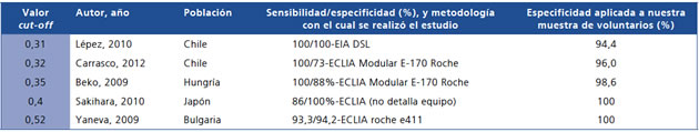 Para Chile el rango sería concordante con los estudios de Lépez y Carrasco, por lo que se podría proponer un rango de normalidad de hasta 0,32 ug/dL, ya que al aumentar el valor de corte a 0,35 ug/dL, alcanza el valor que registró uno de los cinco voluntarios con SC (0,342 ug/dL). Sería interesante contar con más pacientes con SC para establecer la zona gris entre éstos y los voluntarios sin SC.